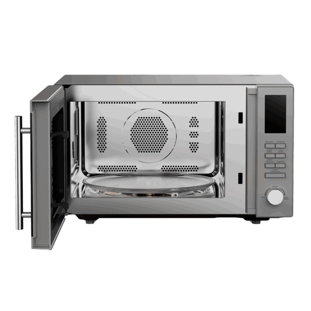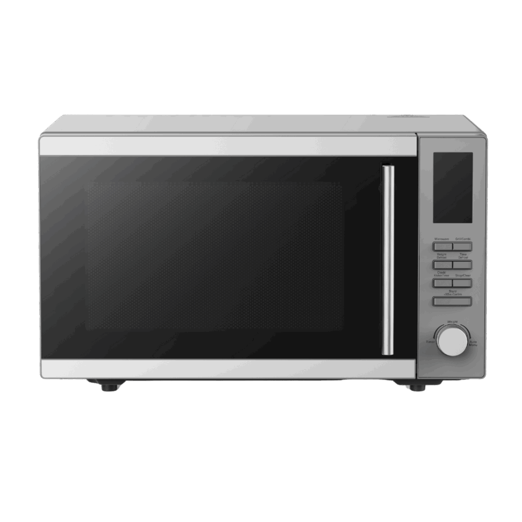 25 LITRI CON GRILL COMBINATO E COMANDI ELETTRONICI Camera di cottura e rivestimento esterno in acciaio inox 25 litri capacitĂ di camera di cottura 8 programmi di cottura automatici, funzione di scongelamento illuminazione interna della camera livelli di potenza: 5 per microonde, 2 per il combinato, 1 per il grill diametro piatto rotante: 315 mm